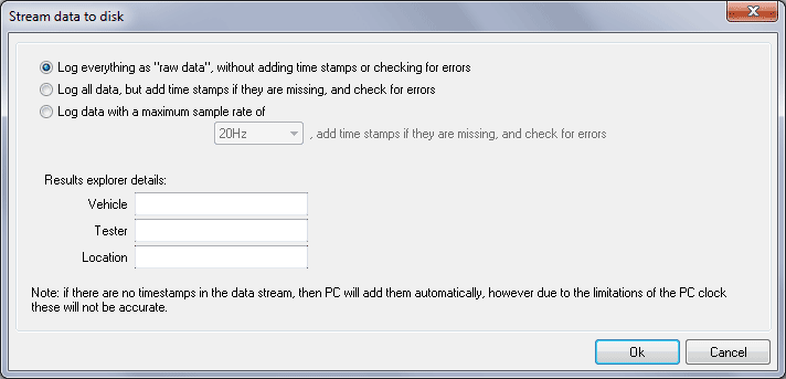 When you click the “Start logging input data to PC disk” menu item, “Stream data to disk” dialog will be open. It has options to select the data logging method (Log Raw data, Log all data or Log data with a sample rate.)