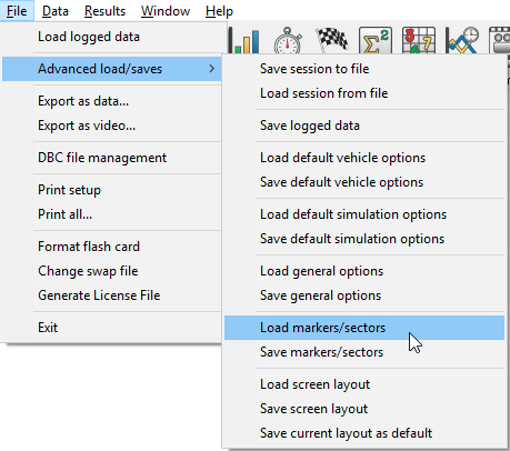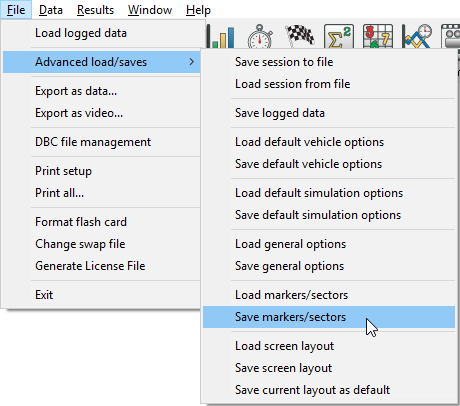 Once you have set up your Lap and Track Markers and Sectors, you can save the information for later use. These marker and sector information get saved in the "Lap and Track Marker" file format (.LAP). To save the markers for a specific circuit go to File > Advanced load/saves > Save markers/sectors.