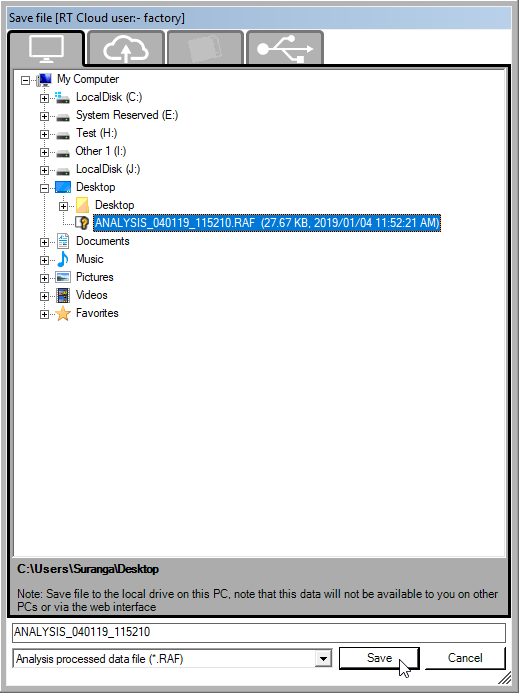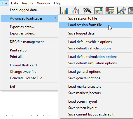 You can save an unfinished analysis working session in a file in the disk and do some analysis on another set of RUNs so that you could continue to work on the previous session again by loading that session from the saved file. These files are saved using the .RAF file format. The processed data is stored in the .RAF file along with many other information like the raw data for all loaded runs, configuration of the track map window and many more. For more information on what the .RAF file stores, click here.