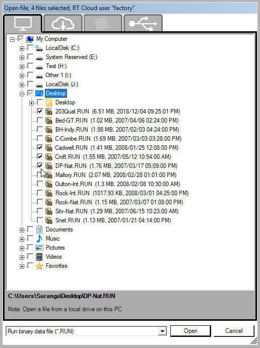 This allows you to load one or multiple .RUN files. To select a file (or files), click on the check-box to the left of the RUN file (or files) name that you want to select. Double clicking the file name will also check the check box. Once you have selected all the RUN files that you want to load, click "Open".