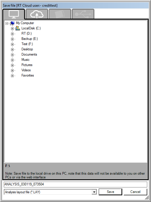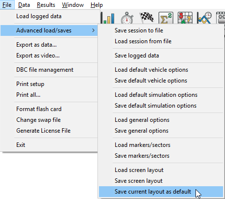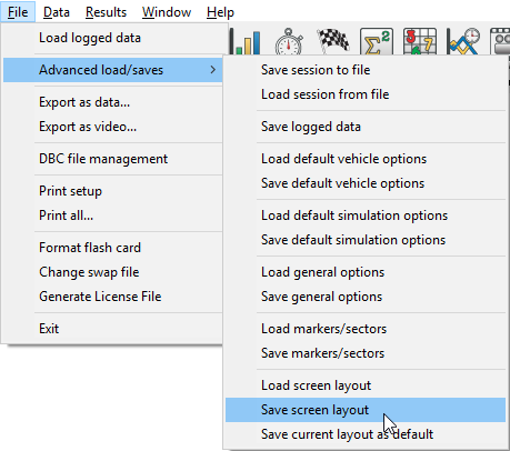 If you wish to overwrite the default screen layout (click here for more details on how to load this on start up) when you click Save Screen Layout from the menu, navigate to the installation path (Usually C:\Program Files\RaceTechnologyV6\) then select the folder for the hardware type you are setting the program up for (e.g. DL1, AX22 etc.), and select the \Analysis\Configuration\ sub directory. In this folder, there will be a ****_default.lay file, where the **** is replaced with the hardware type. This is the file you need to over write for the software to use it as the default.