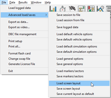 To load a previous screen layout using a .LAY file, go to File > Advanced load/save > Load screen layout.