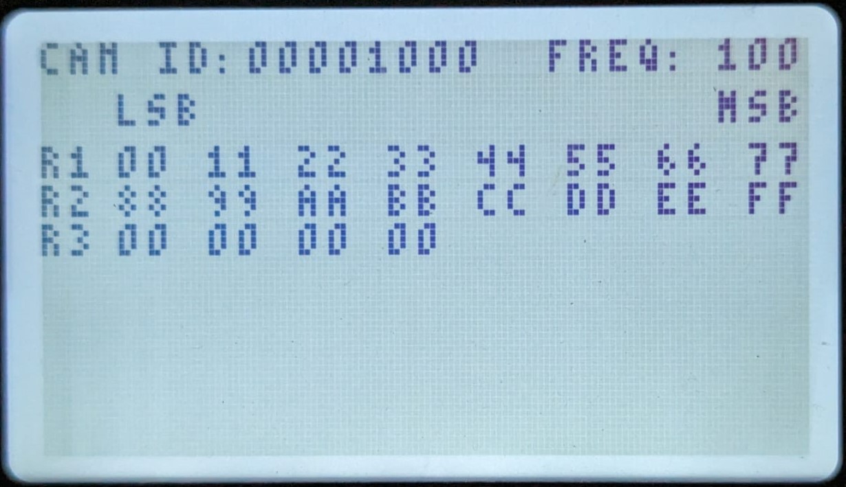If the baud rate is matched with the connected CAN bus, continuously increasing count will be seen on the first screen. Use UP and DOWN buttons to scroll through the variables.