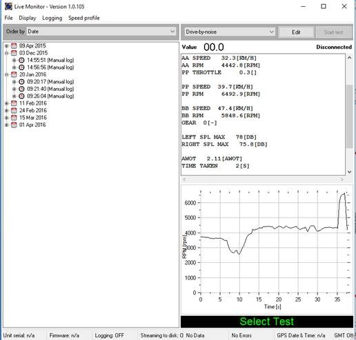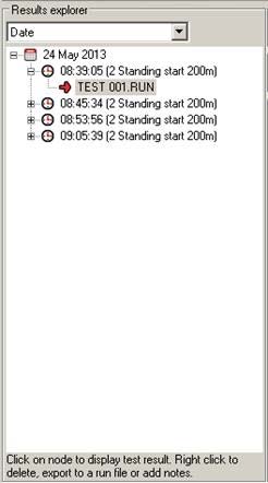 Results explorer shows the entire tests conducted by the user. It can be sorted by date, test schedule, vehicle, tester and test location. User can see the test summary results by selecting the required parent test node. The results graphs will be displayed when user selects a particular test under the parent test node. Further user can Add notes, Export to run file or Delete a test. If the test generates multiple test files all the tests are listed under the parent test node.