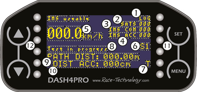 8. Test status, this is either: Prepare to test, this means that the initial test conditions have not been met, for example the vehicle is not going quickly enough to start the brake test. Test armed, this means that the initial test conditions are met and the test can be started. Test in progress, this means that a test is underway.