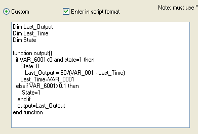 There is one final point about the code above - variables that are defined outside (before) the main output function are persistent (or static) between calls of the output function - this can be very useful. This property allows the code the remember previous values or states and allow time dependant functions like differentiation and filtering etc.