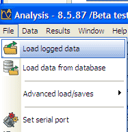 step 1: Once you have entered the analysis software, go to the "file" button in the top, left hand corner of the screen. This will open up a menu. Then select the "Load Logged Data" menu item.