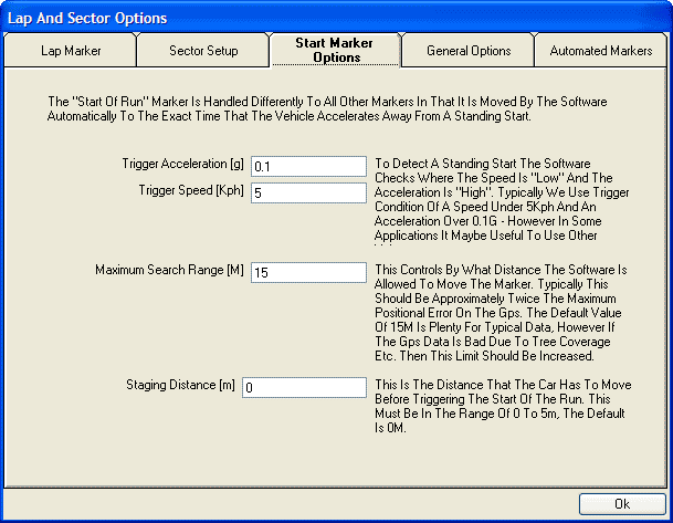 Analysis software moves the start of run marker to the exact time that the vehicle accelerates away from a standing start. To detect a standing start, the software checks where the speed is low and the acceleration is high; Typical values used here are speed under 5kph and an acceleration over 0.1g. However you can change these values based on the application.