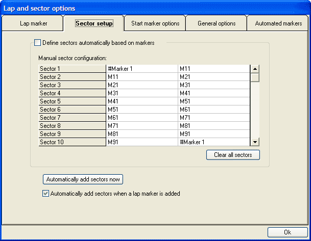 - Alternatively, you can add track markers as required and then manually define sectors based on the track markers. This is completely flexible - for example you can have sector overlapping, or gaps in sectors. The dis-advantage of this approach is that it typically takes longer to set up and use.