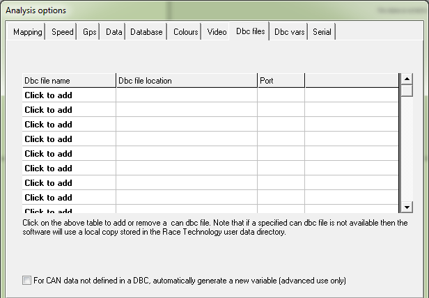 This tab controls which DBC files are loaded into analysis at startup, and hence control what CAN variables are listed in the variable manager