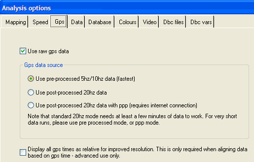 - “Use pre-processed 5Hz/10Hz data”. This is the “normal” mode where the GPS module in the data logger works out its speed and position etc, and the logger stores this information. Depending on the logger hardware, this is either at 5Hz, 10Hz, or 20Hz