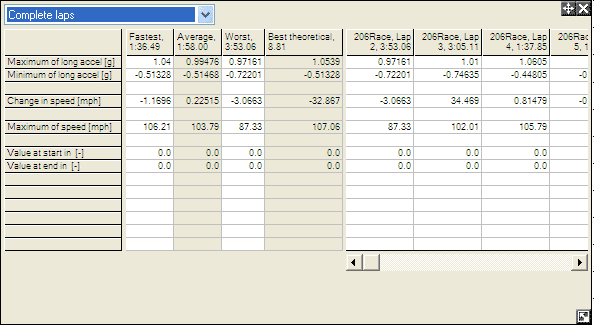 The best theoretical lap is used in both the calculation of the "Time Slip" and "Rate of Time Slip", as well as in the summary statistics. The best theoretical lap is calculated by taking the fastest "bits" of all the data currently loaded in to the program to get a single best possible lap that you could have driven. Note that whilst the "best theoretical lap" is used to calculate internal results, it is not possible to look at the data directly. However since the data is only an ensemble of parts of other runs, it is of course possible to look at the component parts if required.