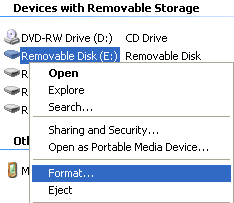 To format through the Windows File Explorer, make sure that the Compact Flash card is plugged in, then open up a Windows File Explorer. Locate the Compact Flash Card, and right click on it, selecting "Format..." from the menu:
