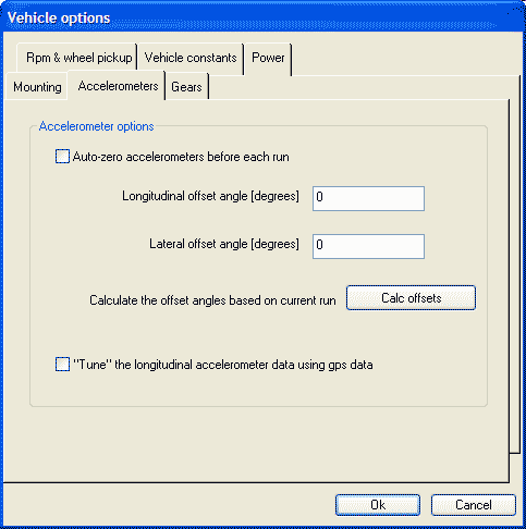 The zeroing options are available in the Vehicle Options. To access them, go to > Data > Vehicle Options, and click on the Accelerometers tab. This will show the following: