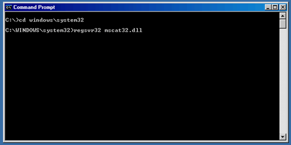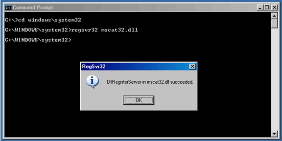 Step #6. Using the dos command “cd” navigate to the directory that contains the DLL you wish to register. In our example we enter “cd \windows\system32”. Once in the correct directory, enter the command to register the DLL. The command is “regsvr32” followed by the DLL’s name, in this case we’ve entered “regsvr32 mscat32.dll”.