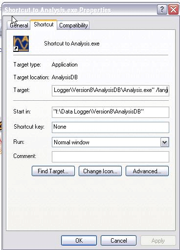 Create a new shortcut to analysis and add a special option /lang