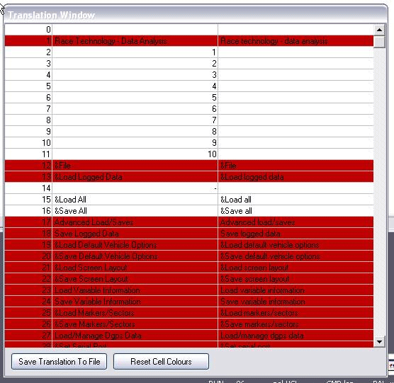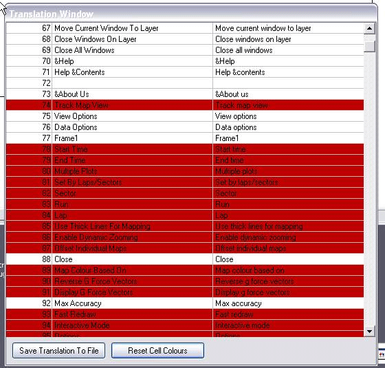 To help you identify strings that are in use when they are accessed by the program they are highlighted. For example, if we click “reset cell colours” and then open a track map then the strings used in the track map are highlighted: