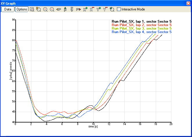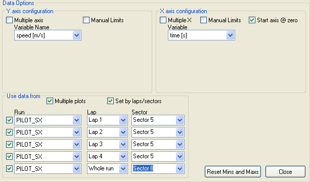 To display multiple plots, i.e. display the same graph for several laps or sectors, go to the Data options and select "Multiple plots" from the "Use data from" section. When you select this, the Multiple Y Axis option will be checked automatically, you can uncheck this if you want to look at the same variable for the different sectors. To compare the speed for sector 5 of the first 4 laps, select Multiple plots, and uncheck Multiple axis for the Y side. Then select the laps and sectors you want to compare, and select speed and time for the Y- and X-axes respectively: