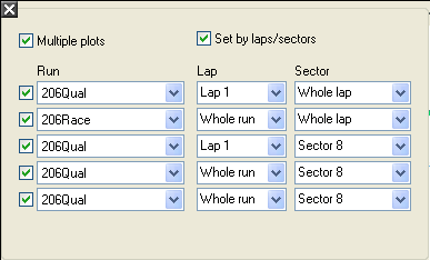 In this example, we have loaded two sets of data on the same track. To display the first lap from each run, select Multiple plots from the "Use data from" section of the options, make sure that the "Set by laps/sectors" option is ticked, then select the runs, laps and sectors you wish to display. Click Close and your choices will be displayed, with colour co-ordination for easier viewing.