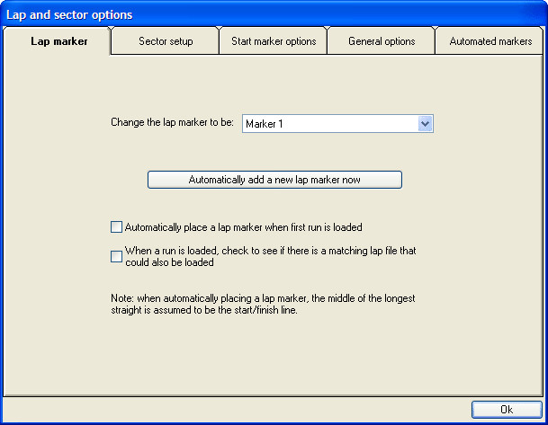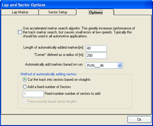 In the Lap and Sector Options, there are three tabs. The Lap Marker Tab allows you to choose which lap marker you wish to add, to let the software add where the lap marker is and whether to let the software add the track marker when you load the .RUN file. Please note that the analysis software has no way to know for sure where the start/finish line is on the track, so if you ask to add a track marker the software simply places the lap marker in the middle of the longest straight section of the track based on the data that is loaded.