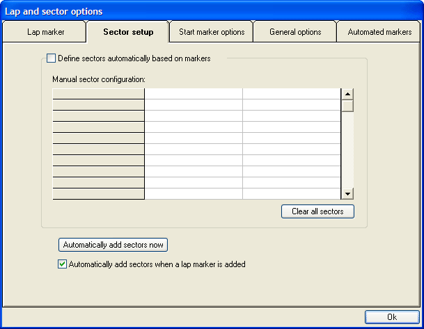 On the Sector Setup tab, you can configure where the sectors are on the map (once they have been placed), automatically add sectors (If you've not defined a lap marker, it will prompt you to add this now. Please note that if you say no to adding the Lap Marker, the software will treat the entire run as one lap), set whether it automatically adds sectors when you add a lap marker (more settings as to how the software does this are on the Options tab.) and clear the sectors all ready on the track.