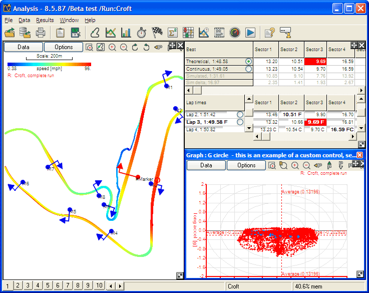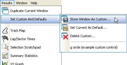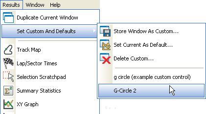 In Version 6 of the software, the different analysis tools will have default settings, i.e. every time you click the track map button, it will open with the same settings. It is possible to save your personal preferences for the different windows for later or default use. This means that you can make your windows open to your preferences, this will also save the position and size of the window. By saving the window to a custom, you can "stick" the options you have chosen to a personalised name, and place the window on the Set Custom And Defaults menu.