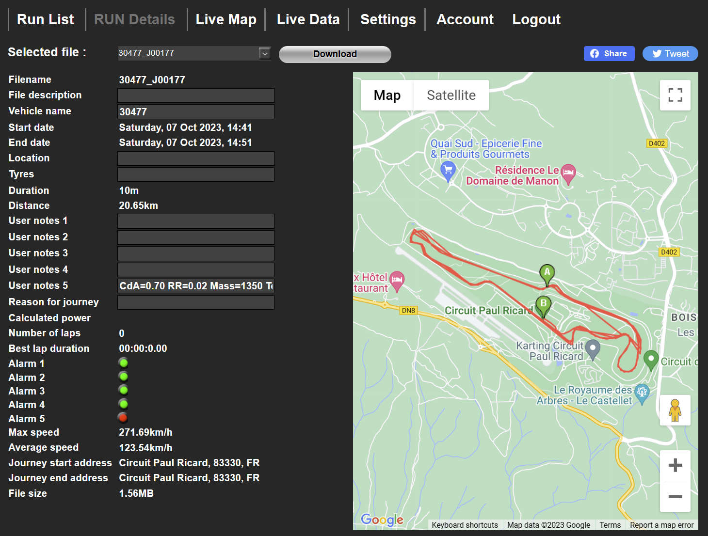 Run details page shows the details of the journeys selected from the Run List page along with the map and also allows you to edit details.
