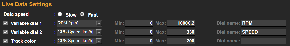 This section allows you to configure the variables to show on the Dials on the Live data page.