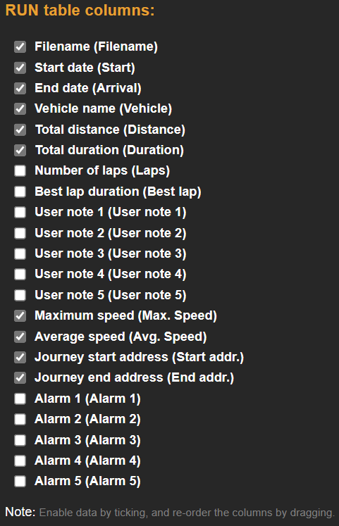 This section is used to enable/Disable table columns displayed on the run data table on the Home tab and to rearrange column order by dragging and dropping the columns.