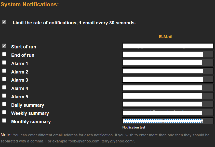 This section is used to configure the system notifications based on start/end of runs and alarms triggered. You can enter different email and mobile phone numbers for each notification.