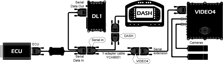 Please note that in this configuration it is important that both the DL1, DASH display and the VIDEO4 are configured to work together correctly. There is more information about this on these pages: