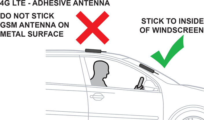 - 4G LTE antenna is adhesive and mounted on the windscreen.