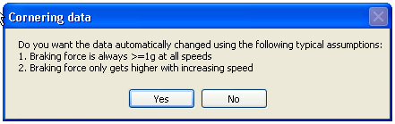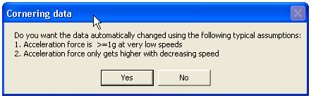 The first option is the simplest, in this case the user simply gives a fixed level of grip that is valid at all speeds. This is a good approximation for cars without significant aerodynamic aids (wings and large splitters etc). For a typical road saloon car with road tyres this figure is “about 1g”, for a race car with slicks and no significant down force this is “about 1.3g”. By looking at old race data then more accurate estimations can be made, however these figures give a good starting point.