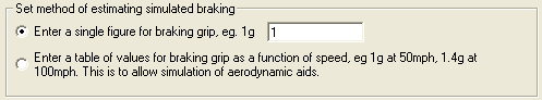 Using this mode of braking simulation, it is possible to have the maximum grip vary with speed. This is essential for simulating cars with large wings or splitters that generate more down force at high speeds. With such aids the vehicle is “pushed down” onto the track at high speeds which increases the grip and makes harder braking possible.