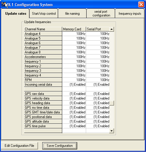 1. Output all analogue and frequency channels at 100Hz to the serial port