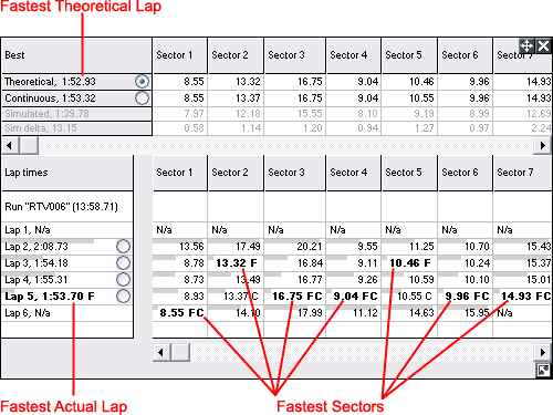 In the lap/sector times window, the bold text indicates the fastest lap and sectors. The fastest sectors are combined to give you a fastest theoretical lap time, shown here. The best drivers will be very consistent, with most of their lap times very close, and very close to their theoretical best.