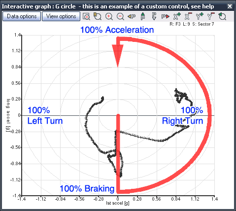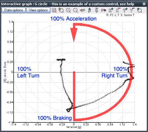 If we look in detail at braking and cornering using the g-circle (Results > Set custom and defaults > g circle (example custom control)) in the image below, we can see that the straight line braking uses plenty of grip. However the braking point is too early, so the driver lets off the brake, and rolls into the corner before turning in.