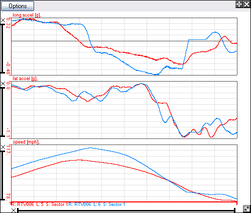 In the graphs below we can see long accel (braking and accelerating) at the top, lat accel (cornering) in the middle and speed at the bottom. We are comparing the red slower sector against the blue faster sector. Note that the long accel graph has a dark line running through the middle, this shows 0g. Above this line is accelerating, below it is braking. We can clearly see that the blue run enters the corner faster, brakes later and harder before turning into the corner at the optimum speed and using all the available cornering grip.