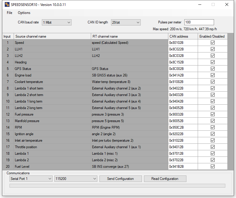 By default the SPEED10 is configured with the following settings: