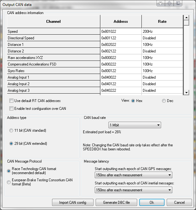 By ticking the box ‘Use default RT CAN addresses’, all addresses will be reset to the default values which work with the .dbc file available for download from the Race Technology website. This is recommended unless different CAN addresses are specifically required.