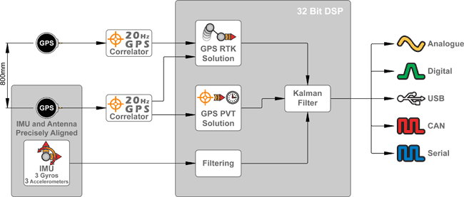 The Kalman filter in the SPEEDBOX INS system combines the data from the GPS, accelerometers, and gyros to give roll, pitch and yaw rates and angles, position, 3 axis acceleration and speed. The combining of this data to give a low latency output is calculated using two distinct solutions.