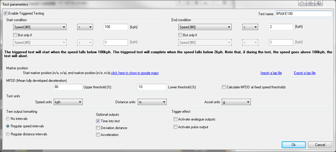 Test start and/or end can be configured to be triggered by the speed passing either above or below the required speed threshold, which can be set in m/s, kph, mph or knots. In the example shown in the screenshot, the test is configured to start when the speed passes below 100kph, and to stop when the speed passes below 2kph. In order to "arm" the test, it is first necessary for the speed to pass above or below the trigger speed in the opposite polarity to that configured by a certain margin in order to avoid triggering on noise whilst passing the speed threshold in the wrong direction. This margin is currently set within the SPEEDBOX firmware at 0.8m/s (2.88kph). Thus in the example shown, it would be necessary to accelerate first to at least 102.88kph in order to arm the test. The test would then become active at the instance the speed hit 100kph whilst decreasing.