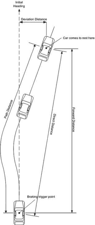 | The distance away from a straight line drawn based on the heading at the start of the test (see diagram above), resolution of 1mm