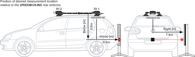 For both the SPEEDBOX lever arm and measurement offset, the locations are referenced to the SPEEDBOX unit. For the SPEEDBOX-INS measurement offset is taken from the INS antenna assembly to the offset point. Measure the distances below, ahead (and right for INS units), using negative values for opposite directions, and input these into the configuration software.