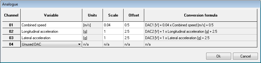 There are four analogue outputs available on the SPEEDBOX, these are accessed through the LEMO connectors on the front of the unit. The configuration for these is done from the main SPEEDBOX configuration software by clicking on the Analogue tab. For each input, the drop down selector box in the ‘variable’ column can be used to select the output. This can either be one of the internal variables which will be used as a DAC output, or it can be used as an ADC input. When used as an analogue input the data will be transmitted on the serial port and CAN ports as analogue channels 1-4.