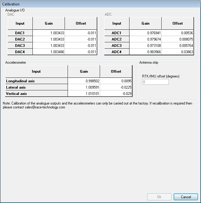 The calibration screen is used to view the calibration values which are used internally in the unit. These are read-only, and can only be changed by Race Technology at the factory.