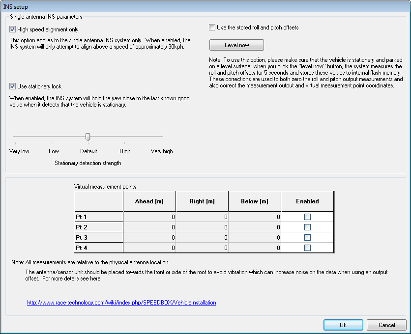 This button sends a command to the SPEEDBOX to measure and store the current offset of the antenna (SPEEDBOX-INS) or base unit (SPEEDBOX) from the horizontal. This should only be done when the vehicle is stationary and level. The SPEEDBOX will flash the blue LED rapidly three times when this is complete in order to provide visual confirmation, and the measured offsets will be stored in non-volatile memory until a new "level now" command is received. Additionally, the computed offsets will be automatically used in order to compensate for small antenna mounting offsets from horizontal relative to the vehicle, unless the "Use the stored roll and pitch offsets" tick-box is subsequently un-ticked (see below).