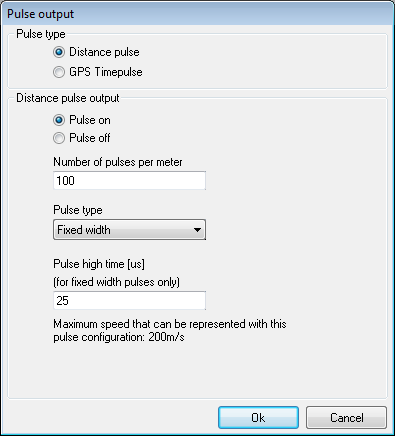 The pulse output from the SPEEDBOX can be set to output either the internally calculated distance pulse, or the once per second GPS timepulse.