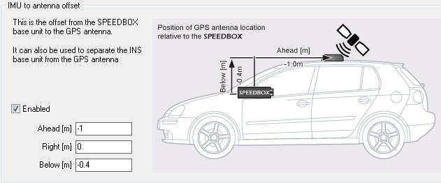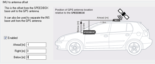 By default, the SPEEDBOX-INS uses an IMU that is co-located with the GPS antenna within the INS antenna assembly, and hence the lever arm between the two is known and does not have to be entered by the user. In this case the "IMU to antenna offset" parameter must be left disabled for the SPEEDBOX-INS. This is the standard use-case for the SPEEDBOX-INS.