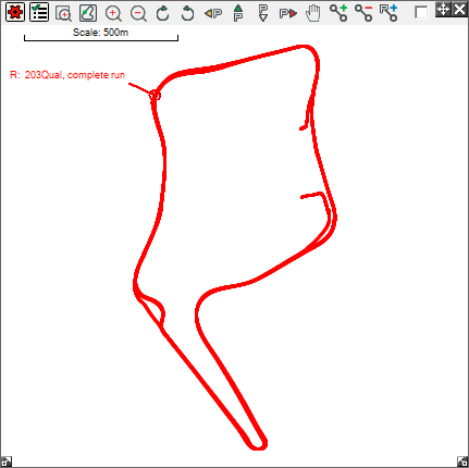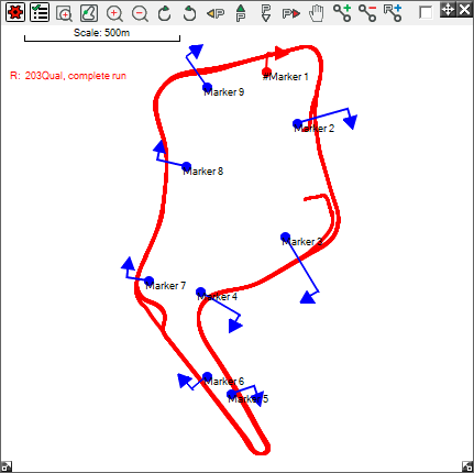 Once you have a .RUN file loaded and the track window open (by selecting it from the Results menu, or by clicking the button on the Tool bar), you can add track markers manually by clicking the button, then clicking and dragging your mouse cursor across the track. The length of the drag will define the length of the track marker and which side of the track you start the drag on will define the direction of travel.